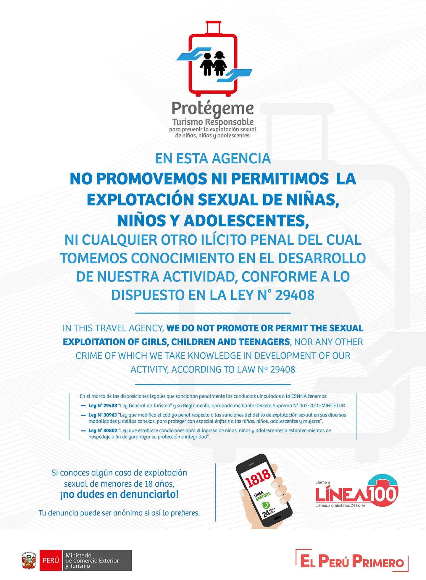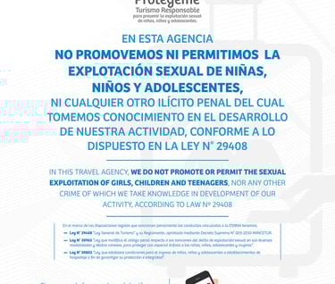 El prestador de servicios turísticos se encuentra obligado a cumplir con los deberes establecidos en la Ley 29408 – Ley General de Turismo y su Reglamento aprobado por Decreto Supremo N° 003-2010-MINCETUR; así como aquellos deberes establecidos en la Ley N° 30802 – Ley que establece condiciones para el ingreso de niñas, niños y adolescentes a establecimientos de hospedaje a fin de garantizar su protección e integridad, poniendo especial diligencia en: